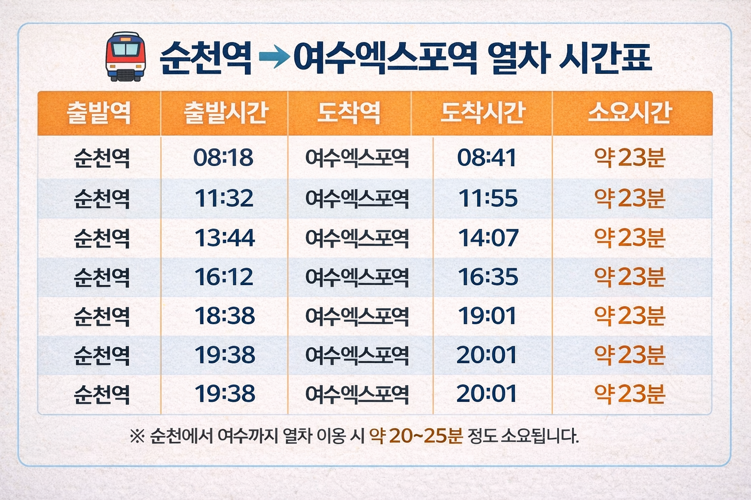 순천역에서 여수엑스포역까지 열차를 이용하면 약 20~30분 정도 소요됩니다.
