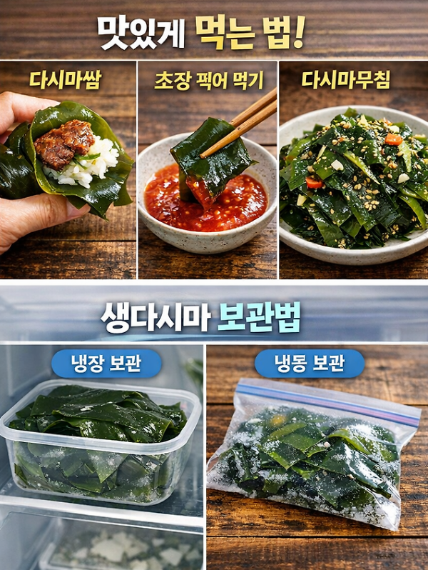 특히 쌈용 생다시마는 살짝 데쳐 먹으면 아삭하면서도 바다향이 은은하게 살아 있어 많은 사람들이 건강식으로 즐겨 먹습니다.